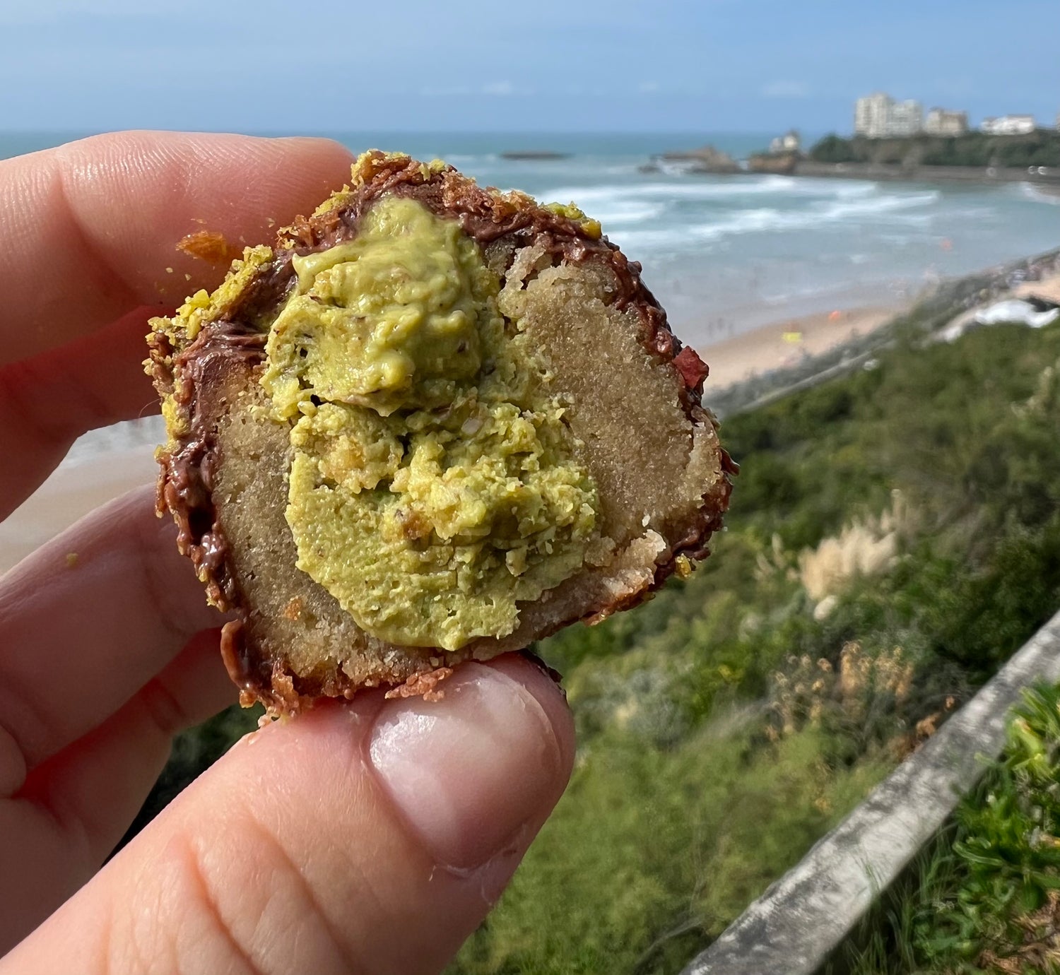 Une coque en chocolat au lait, surplombée par un croustillant de crêpe dentelle, et enfin, de la poudre de pistache légèrement torréfiée.