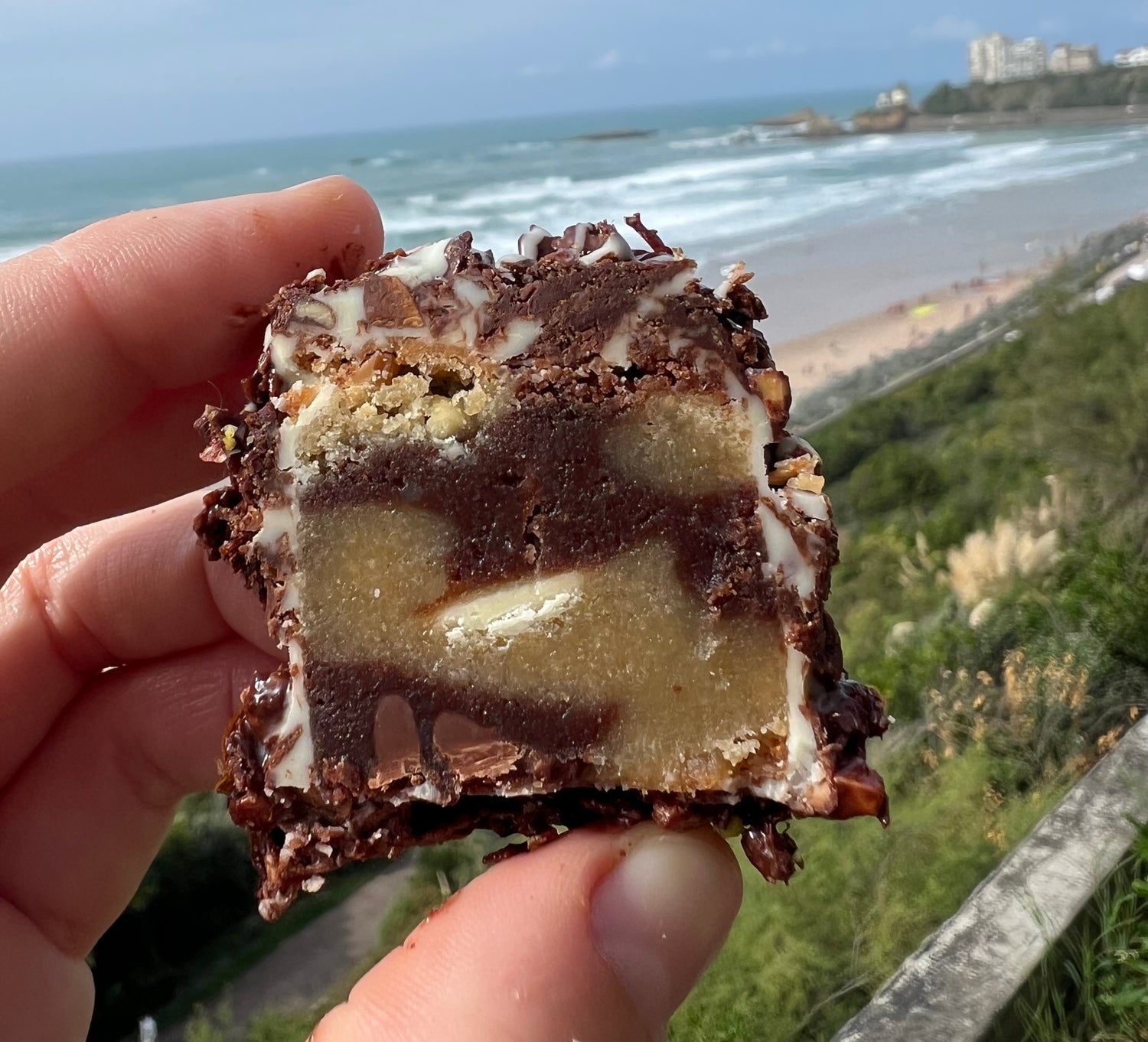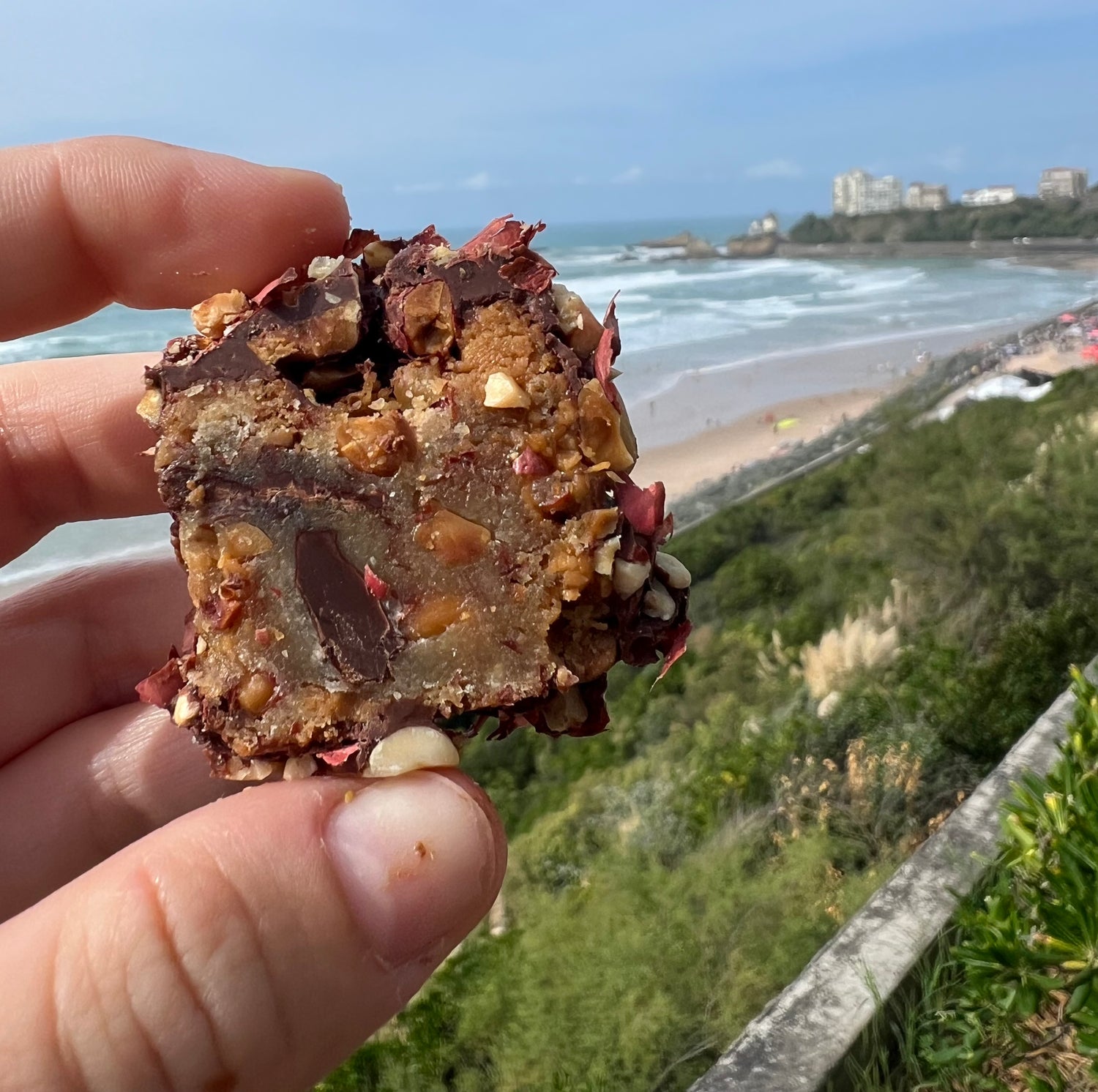 Une pâte à cookie fondante, avec des éclats de cacahuètes de soustons, des morceaux de chocolat noir et de beurre de cacahuète (toujours maison).