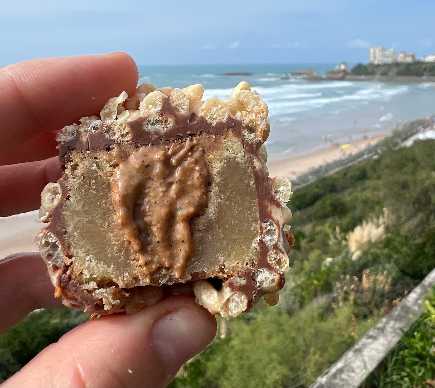 Une coque en chocolat noir vient l'enrober, pour finir par des éclats de cacahuètes de soustons (les meilleures)